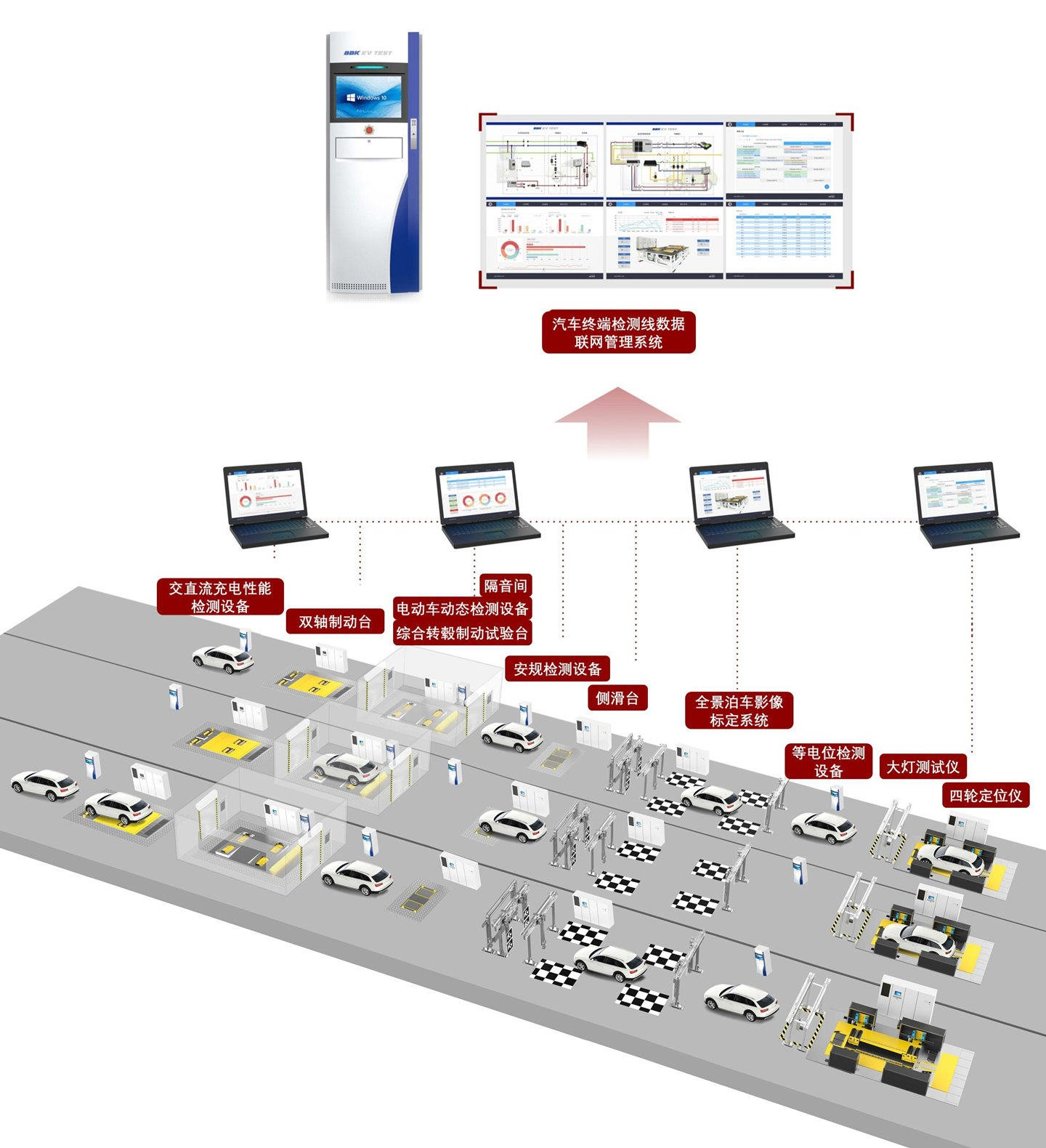 新能源汽车检测系统在燃油汽车检测系统上,增加了电动车动态测试台、电动车等电位检测设备、电动车安规检测设备、交直流充电性能检测设备等专门用于电动车检测的设备,除满足车辆出厂前基本国标要求外,还覆盖了新能源车辆总装厂在汽车组装阶段、整车下线检测阶段的检测需求,以确保新能源车辆零部件及整车的高压绝缘、耐压、导电、充电、电量消耗及制动电量回收等性能。