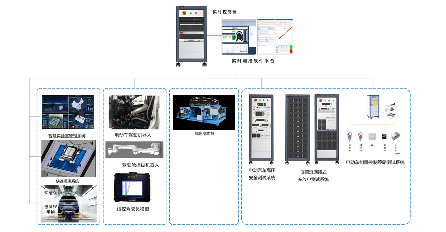 电动车整车实验室测试平台集成了电动车电池及负载模拟、电动车安规检测及充电系统安全检测、电动车能量流检测及分析等技术及相应设备。电动车整车实验室测试平台主要由 Nebula 控制系统、电动汽车高压安全测试系统、直流回馈式充放电测试系统、电动车能量控制策略测试系统、电动车驾驶机器人、环境仓、底盘测功机等设备及系统组成。