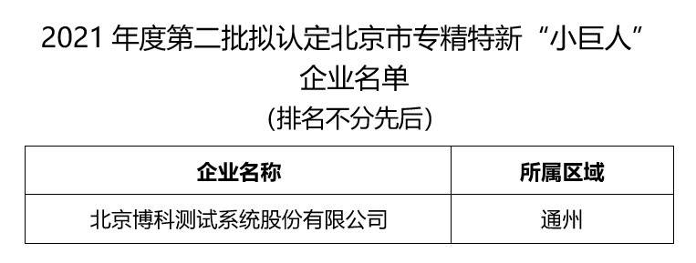 近期,北京市经济和信息化局公示了2021年度第二批拟认定北京市专精特新小巨人企业名单,博科测试凭借创新技术、专业产品、研发能力等多方面的优势,荣获北京市专精特新“小巨人”企业荣誉,这是继博科测试2021年获得北京市“专精特新”中小企业后得到的再次充分肯定。